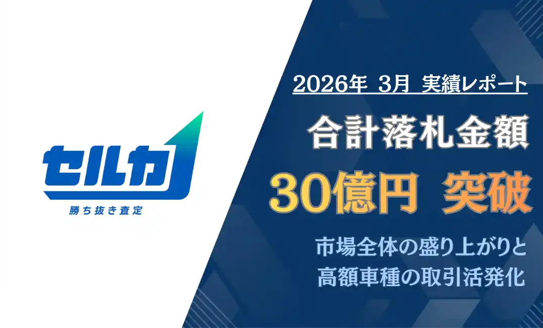 クイック・ネットワーク株式会社(本社:兵庫県神戸市、代表取締役社長:田畑 翔利)が運営する、中古車CtoBオークションサービス 勝ち抜き査定「セルカ」において、2026年3月の平均落札価格は2,211,658円となりました。また落札金額合計が月間で30億円を突破し、市場の盛り上がりを示す結果となりました。 年度末決算に伴う需要の急増や、4,500万円を超える超高額ラグジュアリーSUVの落札などが相場を大きく押し上げています。 |