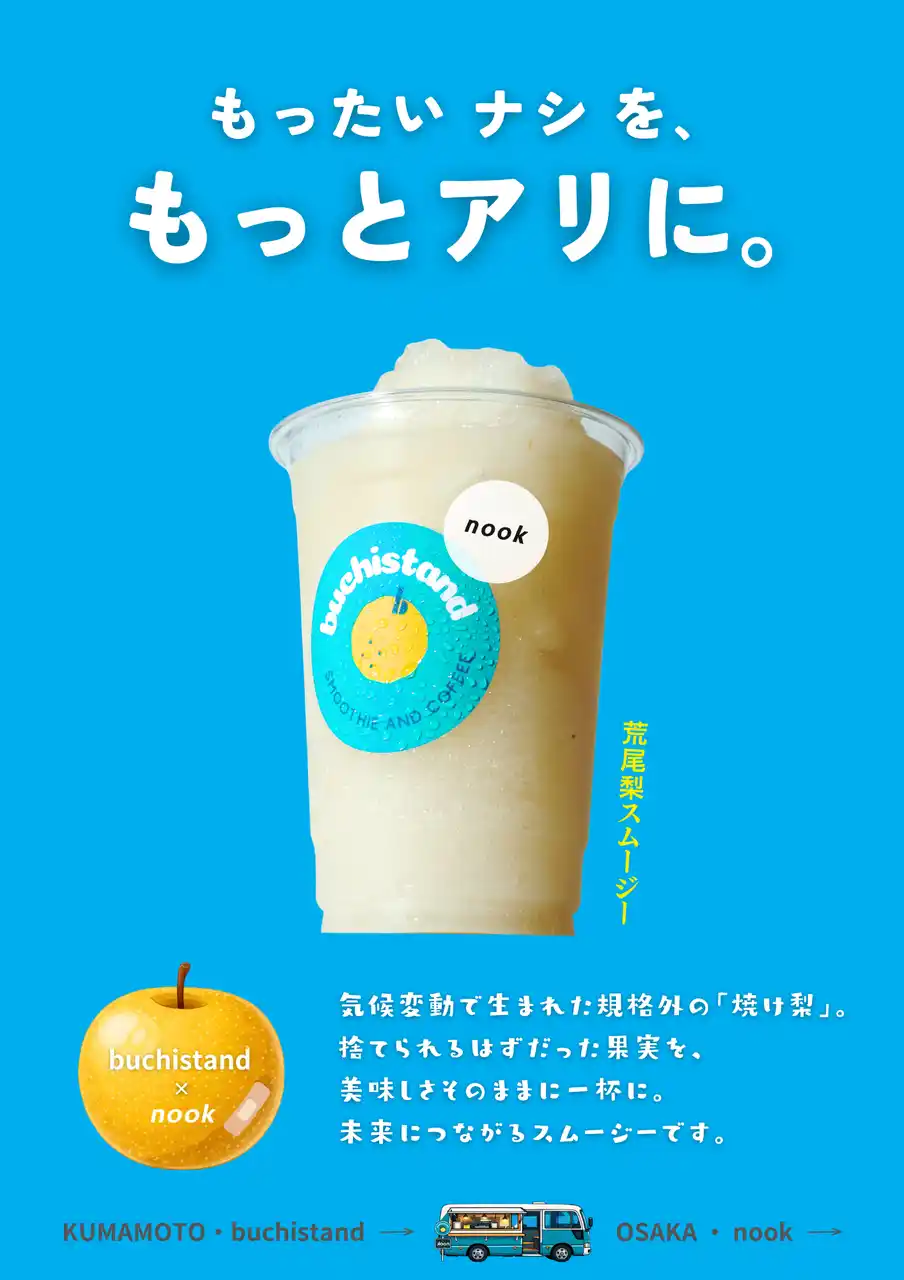 株式会社and(大阪市北区、代表取締役:吉田隆紀)が運営するカフェ&セレクトショップ『nook(ヌーク)中崎町』は、2026年4月11日(土)・12日(日)に梅田スカイビル・グラングリーン大阪にて開催された『第3回 にっぽん青果祭』に出店いたしました。昨年の同イベントでの出会いをきっかけに実現した、熊本県荒尾市の梨農園「buchistand(ぶちスタンド)」との共同出店。深刻な廃棄問題を抱える「焼け梨」を活用したスムージーを通じ、2日間で多くの来場者に「食の未来を考える」体験を提供したことをお知らせいたします。 |
