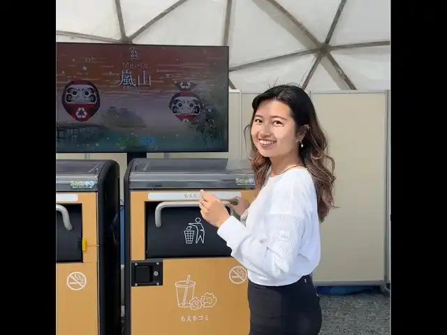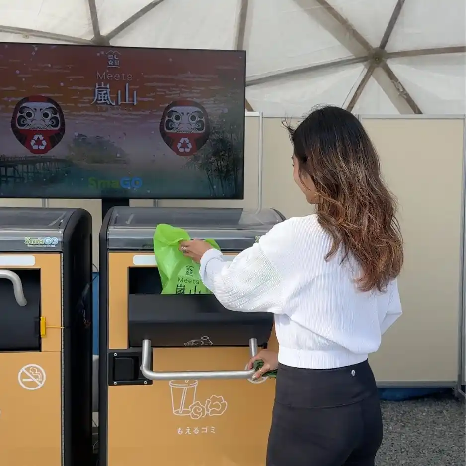 | 本クリーンアップイベントでは、参加者が嵐山周辺で拾ったゴミをSmaGOに投入すると、モニター上に映像演出が表示され、地元の名産品やクーポンなどが当たるネイキッドの体験型コンテンツ「ゴミ捨てアート」を実施しました。 | ||||||||