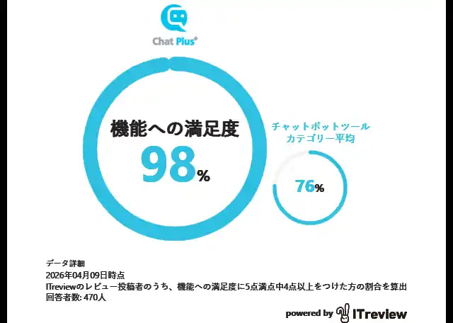 「ChatPlus(チャットプラス)」は、Webサイトや社内ポータルサイト、アプリケーションに簡単に埋め込むことができる、AIチャットボット/AIエージェント/チャットサポートシステムです。 AIエージェントによる応答、シナリオ型、有人とのによるハイブリットなど、様々な運用にあわせカスタマイズができ、外部のレビューサービスからも日本を代表するクラウドサービスとして高い評価を得ています。「ITreview」上でも、「ChatPlus」は511件のレビューを獲得しており、多くのユーザーから確かな評価をいただいています。(2026年4月時点) |