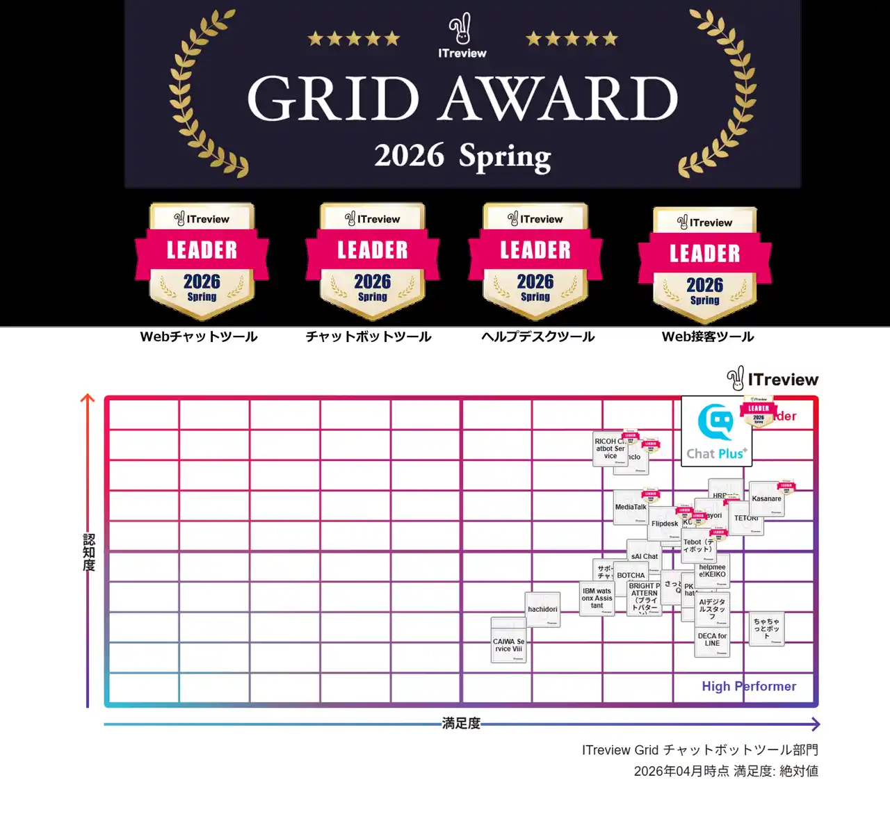 | IT製品レビューサイト「ITreview」にて、チャットプラス株式会社が提供する「ChatPlus(チャットプラス)」は、「ITreview Grid Award 2026 Spring」において4部門でLeaderを受賞し、累計27期連続での受賞となりました。 | |||