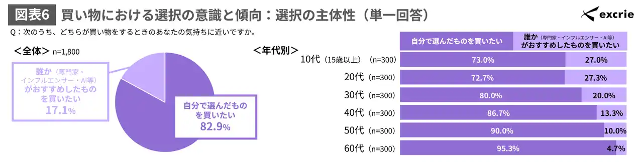 買い物をするときの選択の主体性に対する気持ちを聴取したところ、「自分で選んだものを買いたい」が82.9%、「誰か(専門家・インフルエンサー・AI等)がおすすめしたものを買いたい」は17.1%となっています。また、若年層ほど「誰か(専門家・インフルエンサー・AI等)がおすすめしたものを買いたい」の割合が高い結果となりました。(図表6) |