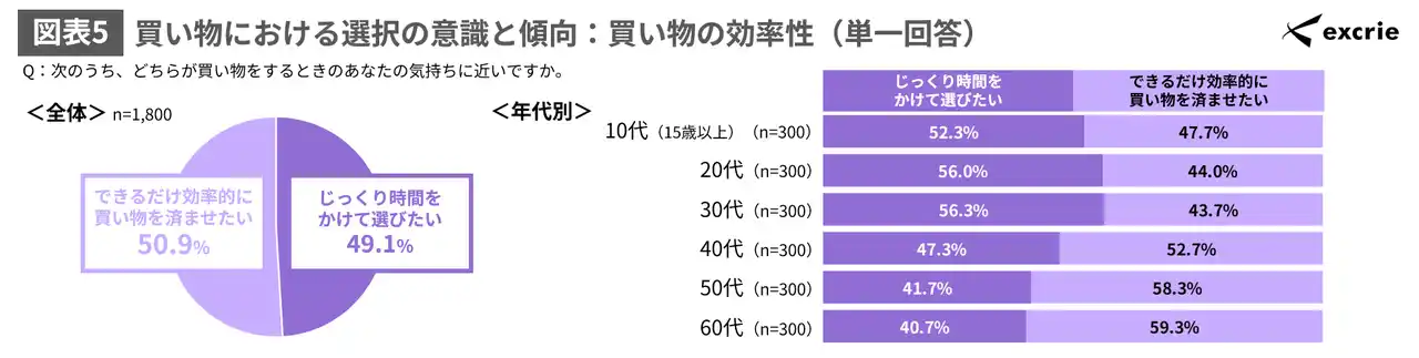 買い物をするときの効率性に対する気持ちを聴取したところ、若年層は「じっくり時間をかけて選びたい」が高い一方、40代以降は「できるだけ効率的に買い物を済ませたい」が過半数となっています。(図表5) |