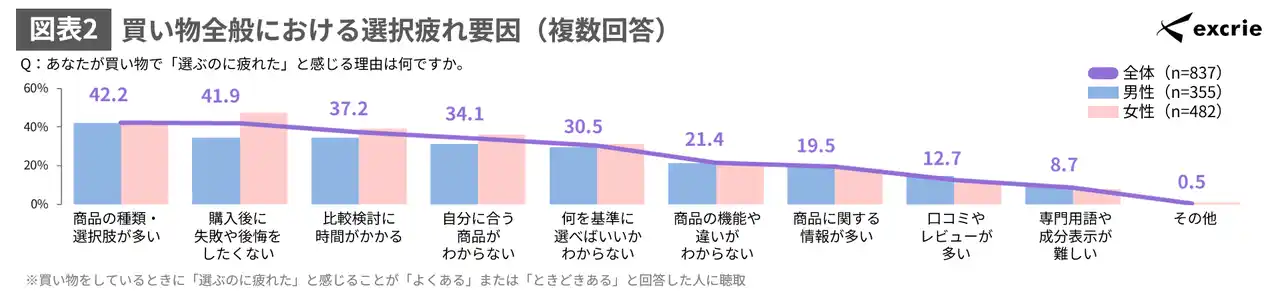 買い物で「選ぶのに疲れた」と感じる理由を聴取したところ、「商品の種類・選択肢が多い」が42.2%と最も高く、次いで「購入後に失敗や後悔をしたくない」が41.9%となっています。(図表2) |