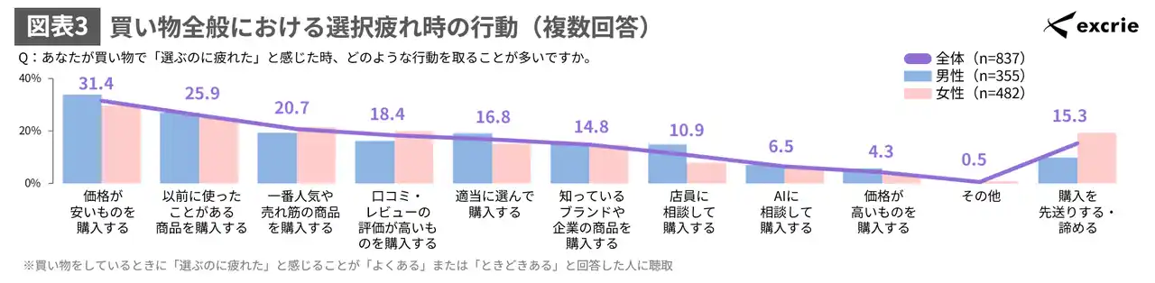 買い物で「選ぶのに疲れた」と感じた時の行動を聴取したところ、全体では「価格が安いものを購入する」が31.4%と最も高く、次いで「以前に使ったことがある商品を購入する」が25.9%となっています。「購入を先送りにする・諦める」については、男性より女性の方が高い結果となりました。(図表3) |