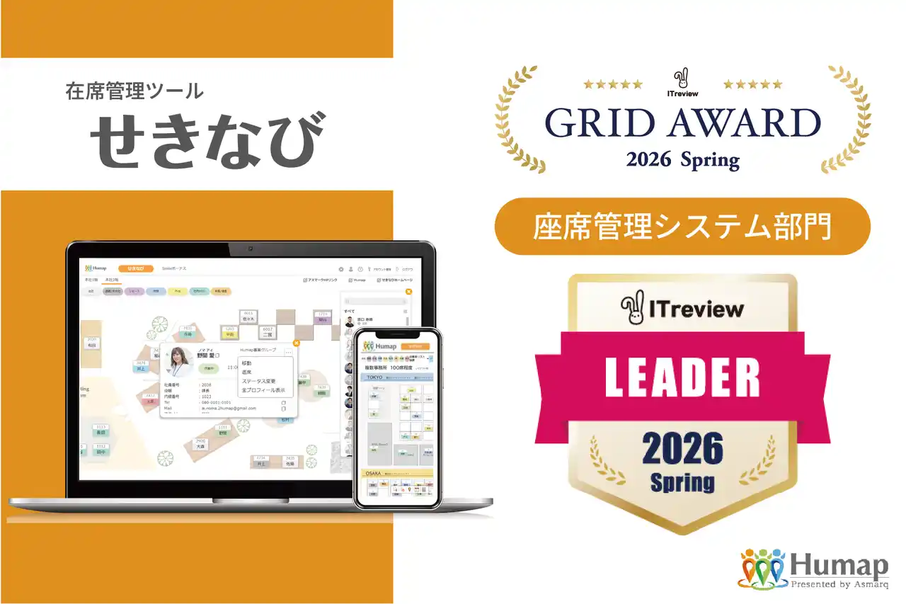 株式会社アスマーク(本社:東京都渋谷区、代表取締役:町田 正一)の従業員総活躍サービス「Humap(ヒューマップ)」が提供する、在席・座席管理ツール『せきなび』は、アイティクラウド株式会社(本社:東京都港区、代表取締役社長:黒野 源太)が運営するIT製品比較サイト「ITreview(アイティレビュー)」において、2026年4月に発表された「ITreview Grid Award 2026 Spring」の座席管理システム部門で、最高位である「Leader」を初めて受賞いたしました。 |