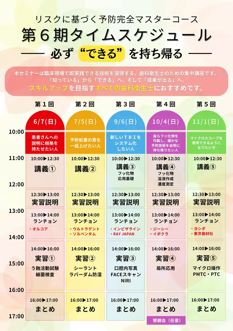 | 全5回で予防歯科の知識と技術を身につける設計となっており、「知っている」から「できる」へと確実にステップアップできる内容です。なお、各回ごとの単発参加も歓迎しており、ご都合や関心のあるテーマに合わせてご参加いただけます。 | |||