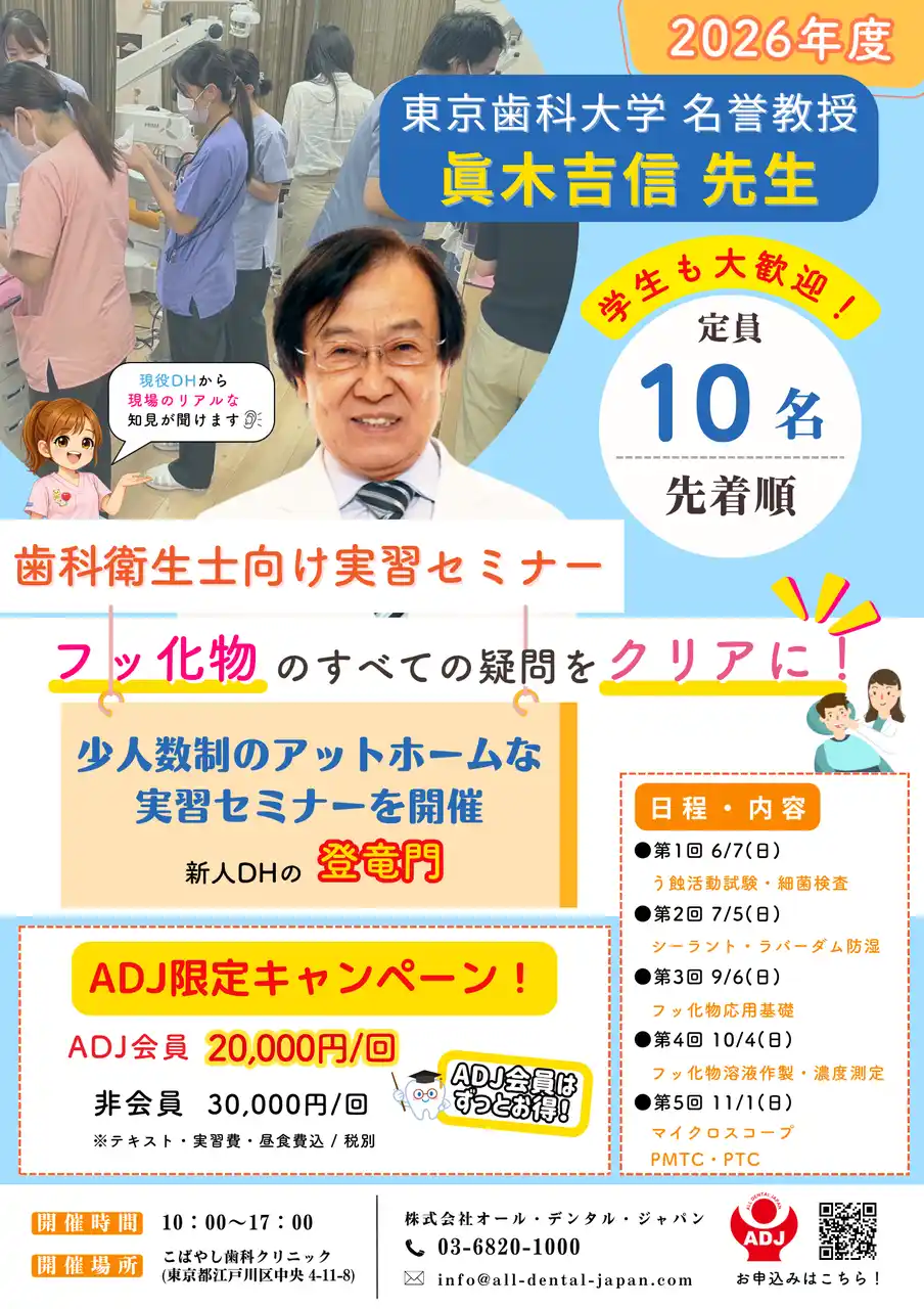 | 株式会社オール・デンタル・ジャパンは、歯科衛生士の臨床スキル向上と医院全体の予防レベル向上を目的とした「予防歯科・フッ化物実習セミナー(全5回)」を東京都江戸川区にて開催いたします。 | |||