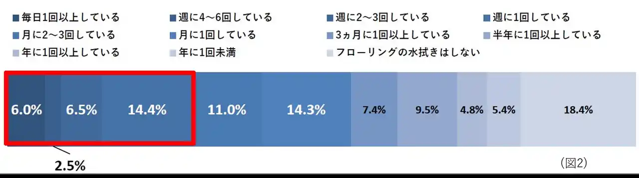 実際に、ダイソンが実施したフローリング掃除に関する意識調査によると、床掃除に水拭き掃除が重要だと感じている人は75.4%に上ります(図1)*²。一方で、週に1回以上実施すると回答した人は30%を下回る結果となり、ニーズに対して普及が十分に進んでいない現状が見られます(図2)*²。 |