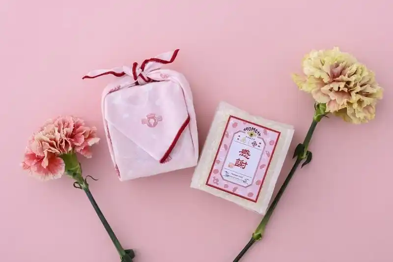 カーネーションのデザインをあしらったこふろしきに、お母さんへの「感謝」のメッセージを伝える2合キューブのお米が包まれたプチギフトにぴったりなセット。柔らかい手ざわりの生地を使用したこふろしきは、手ぬぐいやハンカチとして繰り返しお使いいただけます。それぞれ単品でもお買い求めいただけます。 |