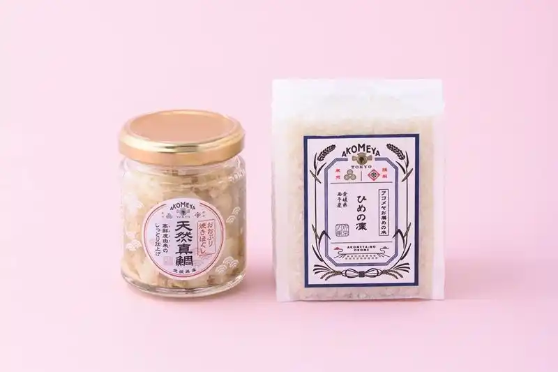愛媛県オリジナル品種「ひめの凜」は、大粒で透き通るような美しさと華やかな香り、上品な甘さが魅力。同じく愛媛県産の天然真鯛を焼いて塩で味付けし、おおぶりにほぐしたごはんのお供「天然真鯛の焼きほぐし」との相性も抜群。瀬戸内の恵みを堪能できます。 |