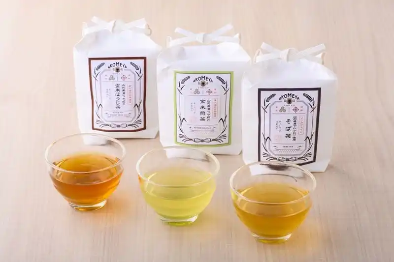 鮮やかな緑が美しい玄米煎茶、まろやかで香ばしい玄米ほうじ茶、香り高い風味のそば茶は、どれも贈り物にぴったりな米袋デザインのパッケージ入り。 |