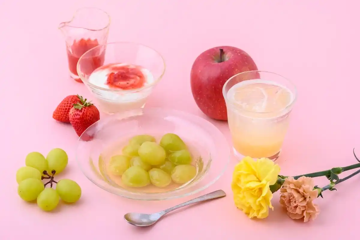 糖度が高く、爽やかで上品な芳香、芳醇な味わいの国産大粒シャインマスカットを、果肉の風味を損なわないようにライトなシロップに漬け込みました。 |