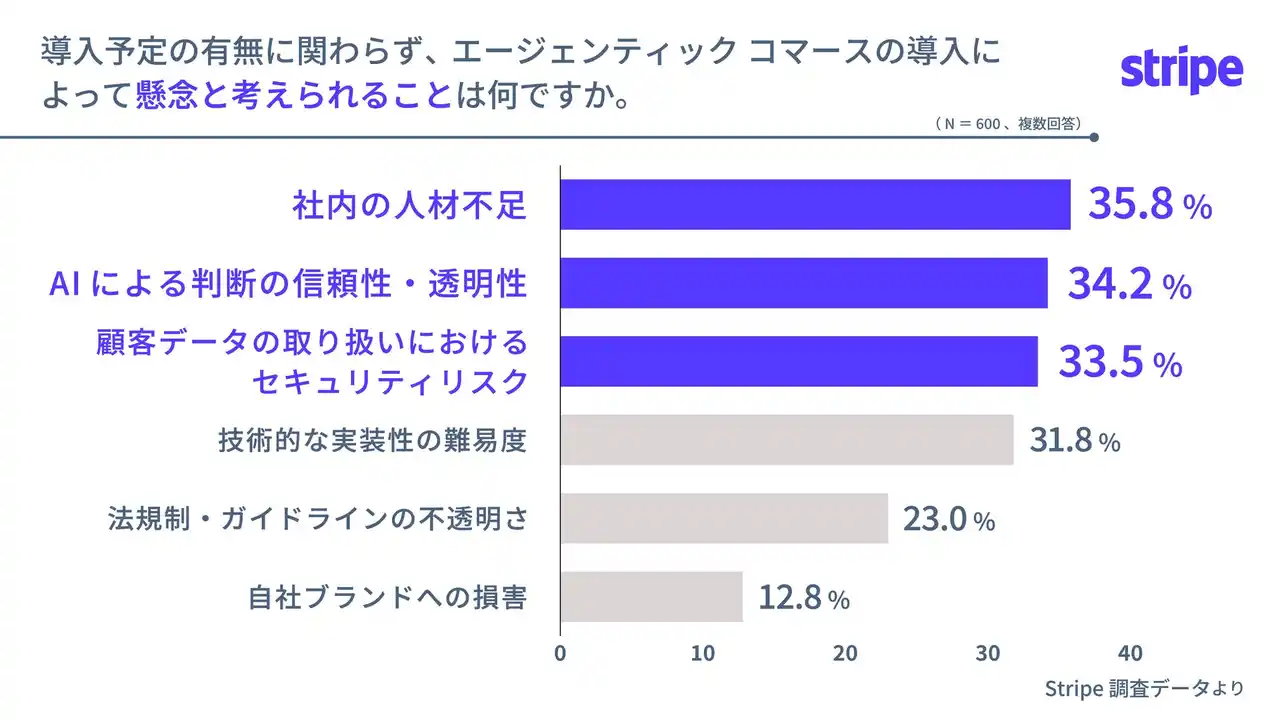 エージェンティック コマースの導入で期待することとして、「自動化・業務効率化」と「購買率・売上向上」が上位に。一方、導入に向けてはセキュリティ対策や顧客データ基盤の整備を含めたシステムのアップグレードや連携を必要とする企業が多く存在。また導入に当たっての懸念点として、「社内の人材不足」が最も多く、AI への信頼性もハードルの一つであることが明らかに。 |