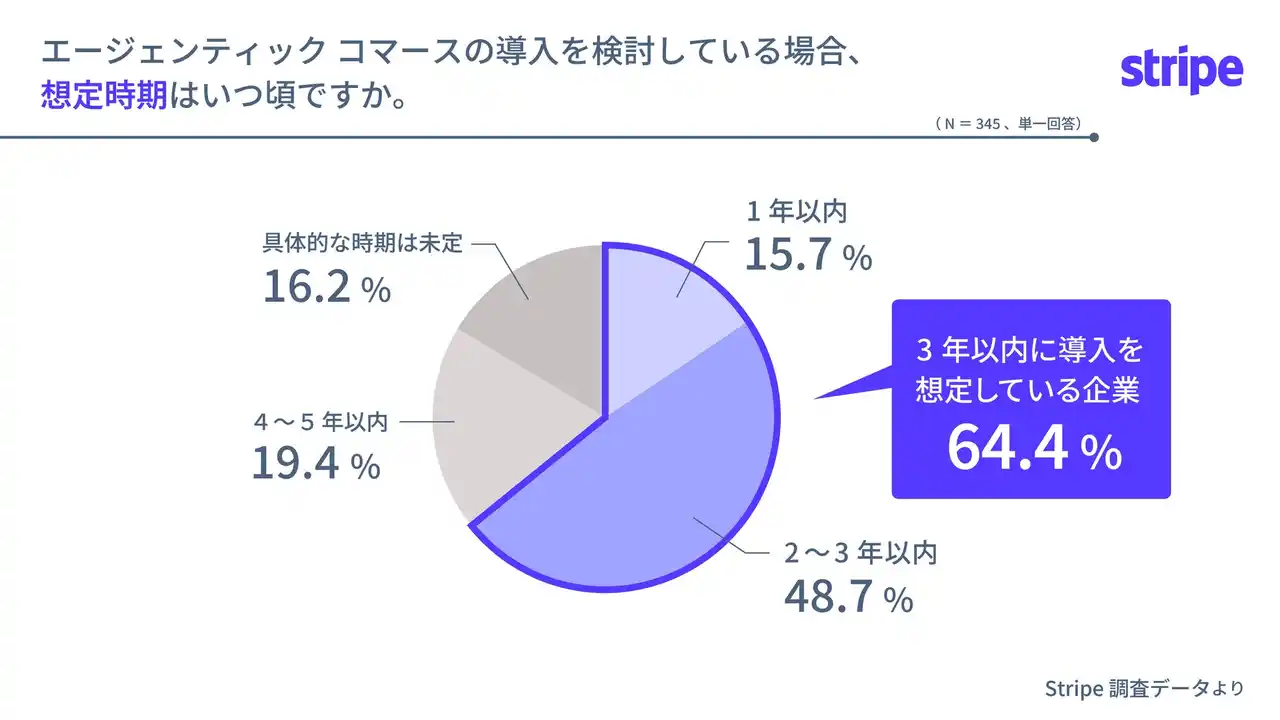 エージェンティック コマースの導入に向けた対応状況について、全体の約 6 割 (57.5%) の企業が導入を検討していると回答。またそのうち、64.4% が 3 年以内の導入に向けて計画を進めており、早期導入に意欲的なことが判明。