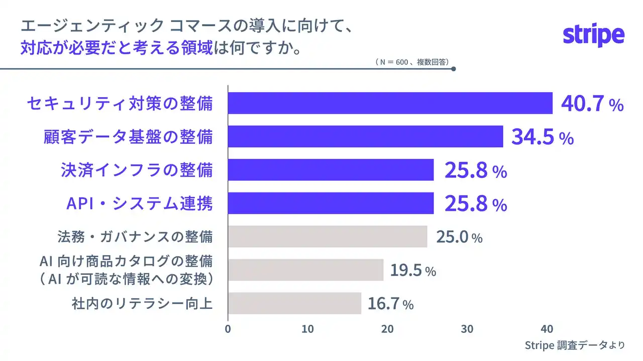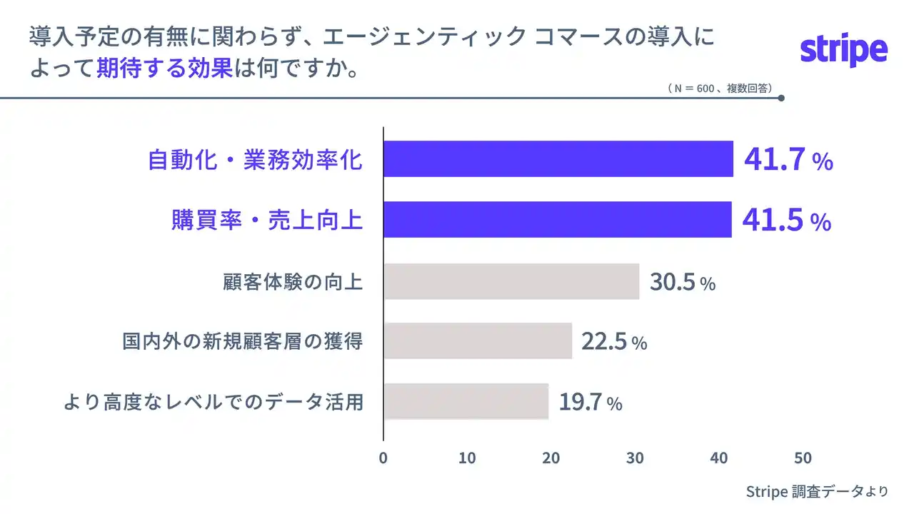 「今回の調査結果から、エージェンティック コマースに対して多くの企業が自動化や売上向上、消費者との関係性向上といった幅広い可能性に期待を寄せている一方で、人材不足や AI エージェントに対応したシステム連携といった課題も見えてきました。今後は、こうした懸念を解消しながら、安全かつ透明性の高い形で AI を活用できる基盤の整備が、エージェンティック コマースの導入を加速する鍵になると考えています。Stripe は、企業が安心して導入を進められるよう、 AI エージェント向けの包括的な経済圏の形成に取り組んでまいります。」 |