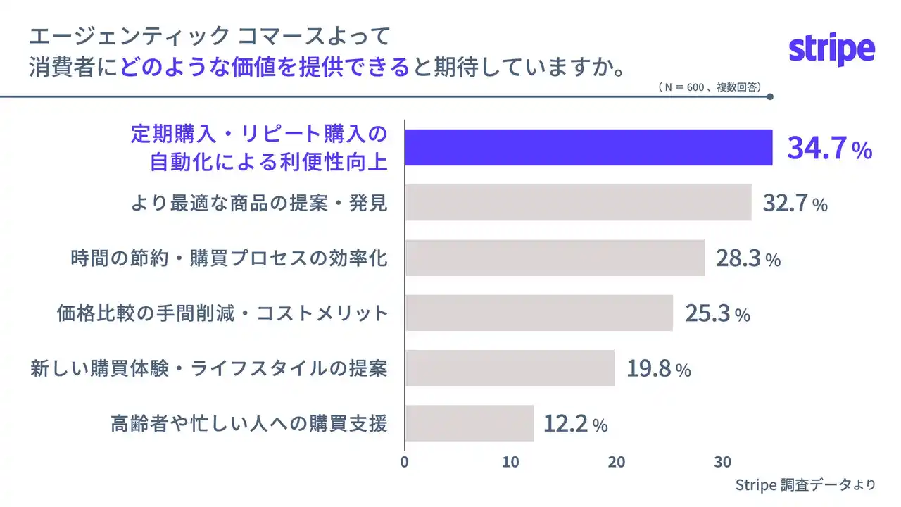さらに、「エージェンティック コマースによって、消費者にどのような価値を提供できると期待していますか。」という質問に対しては、「定期購入・リピート購入の自動化による利便性向上」(34.7%) と回答した企業が一番多くなりました。企業側も現時点においては、エージェンティック コマースは継続的な利用が想定されるサービスにおいて、一番価値を提供できると捉えていることになります。 |
