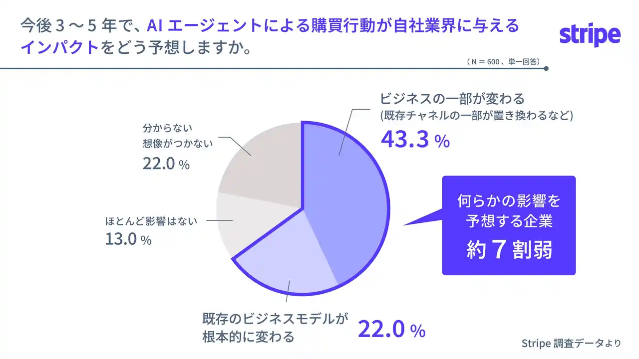 日本では未展開だが、「エージェンティック コマース」というワードや概念は既に浸透し始めていることが判明。また、約 7 割もの企業が、近い将来、日本のビジネスに何らかの影響を及ぼすと予想。 |