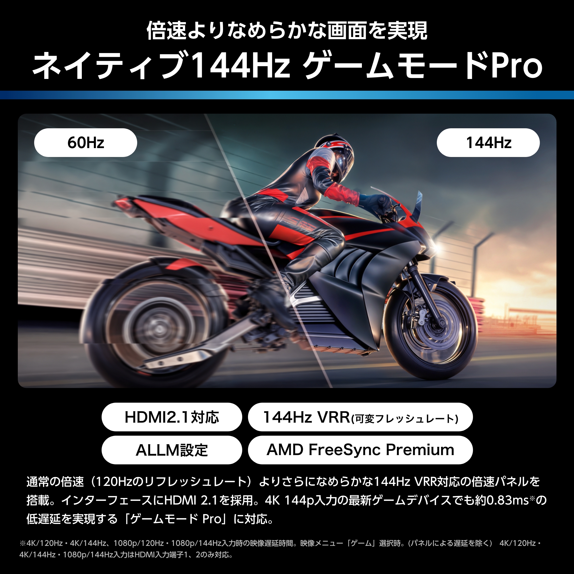※4K/120Hz・4K/144Hz、1080p/120Hz・1080p/144Hz入力時の映像遅延時間。映像メニュー「ゲーム」選択時。4K/120Hz・4K/144Hz・1080p/144Hz入力はHDMI入力端子1、2のみ対応。