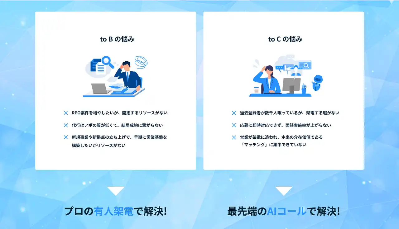 | 本サービスは、人材業界に特化した知見を持つプロ営業と、自社開発のAIコールシステムを掛け合わせることで、これまでリソース不足で取りこぼされていた貴重な商談・面談機会を創出します。 | ||||||||||||