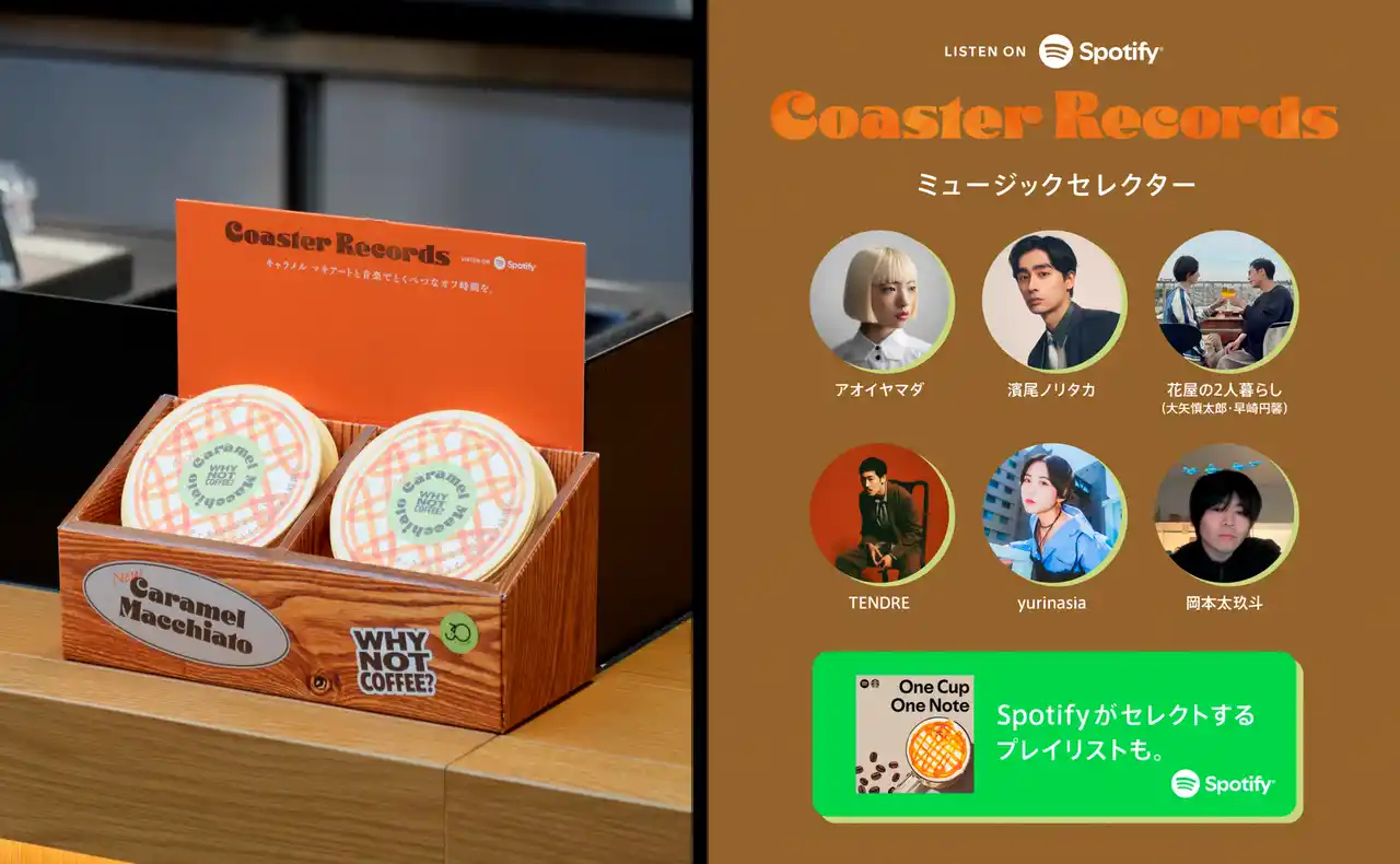 新しいキャラメル マキアートと一緒に楽しむプレイリスト。レコードをイメージしたコースターも