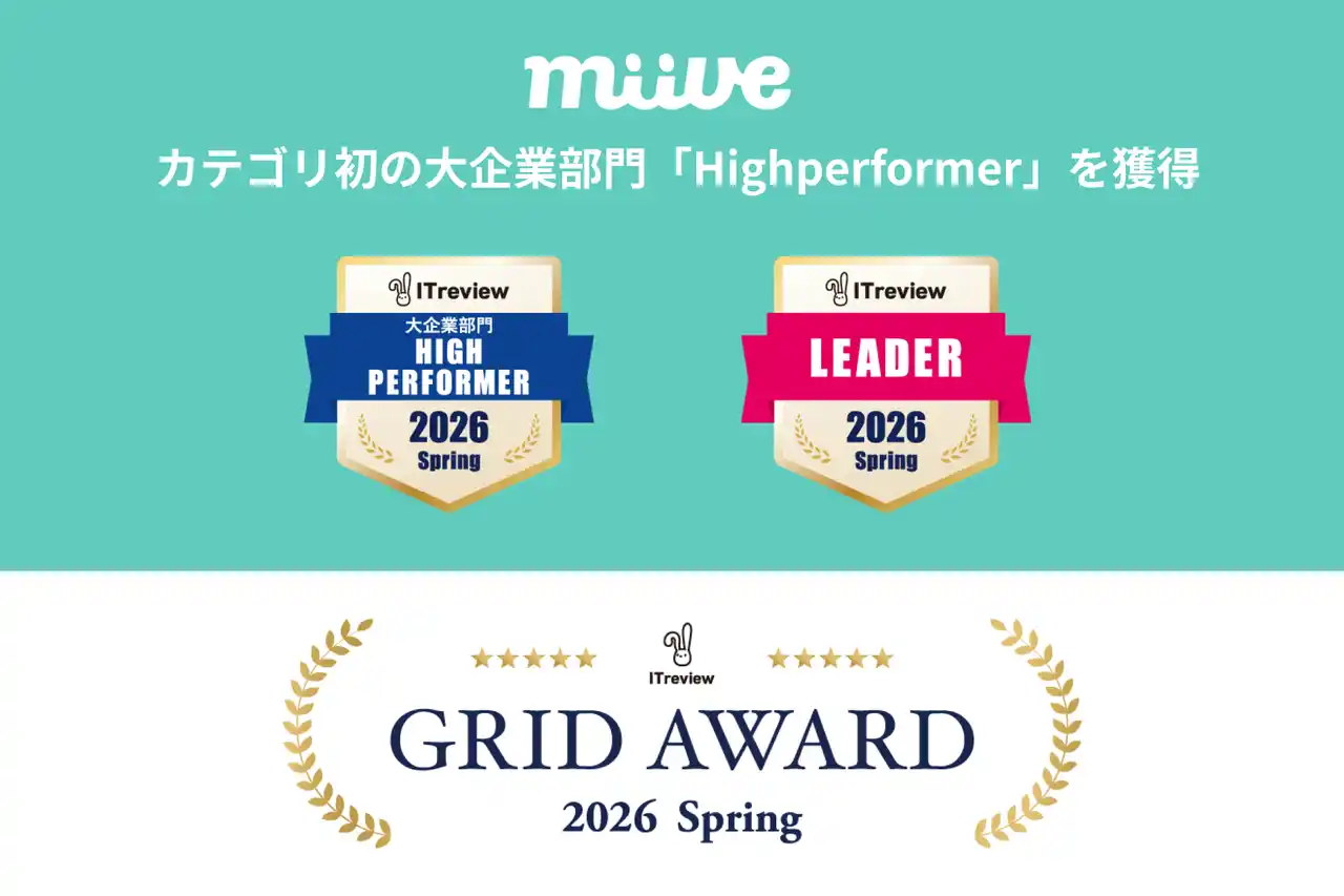 | 株式会社miive(本社:東京都渋谷区、代表取締役CEO:栗田 廉)が提供する福利厚生プラットフォーム「miive(ミーブ)」はこのたび、ITreview Grid Award 2026 Springにて、カテゴリ初の大企業部門「High performer(ハイパフォーマー)」ならびに9期連続で最高評価「Leader」、を獲得したことをお知らせいたします。 | |||
