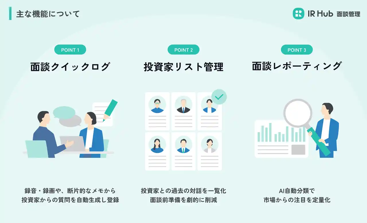 正式リリースに先立ち、先行してご利用いただいた企業様からは、「過去の対話内容を即座に振り返ることができるため、面談準備の効率が格段に向上した」「投資家の関心の推移を追うための準備時間がほぼゼロになった」「市場の注目テーマを定量的に示せるようになり、経営陣へのフィードバックがより説得力のあるものになった」といった、高い評価をいただいております。 |