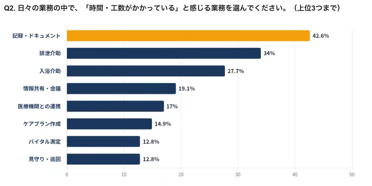 「時間・工数がかかっている」と感じる業務(上位3つまで選択)を尋ねたところ、「記録・ドキュメント入力」が42.6%でトップとなりました。次いで「排泄介助(おむつ交換含む)」34.0%、「入浴介助」27.7%と、身体介護と事務作業が上位を占めました。 |