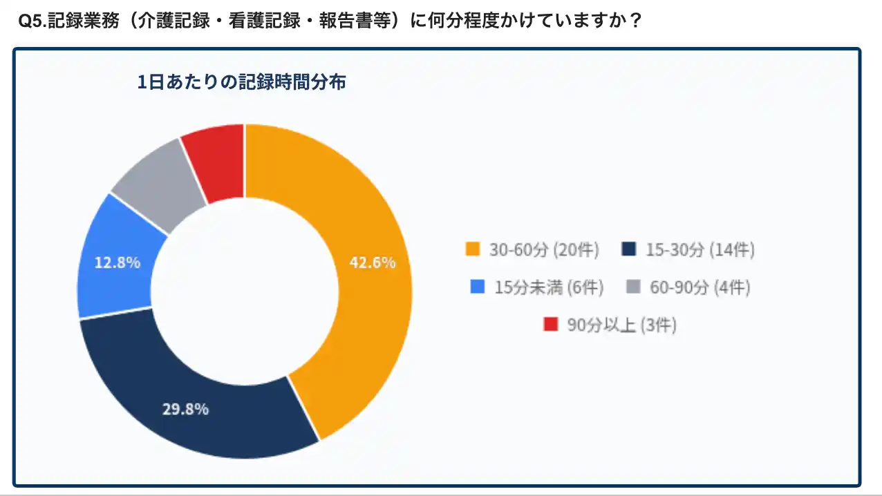 「記録業務(介護記録・看護記録・報告書等)に1日あたり何分程度かけているか」を尋ねたところ、「30~60分」が42.6%で最多。60分以上かける職員も合わせると、57.4%が1日30分以上を記録業務に費やしている実態が明らかになりました。 |