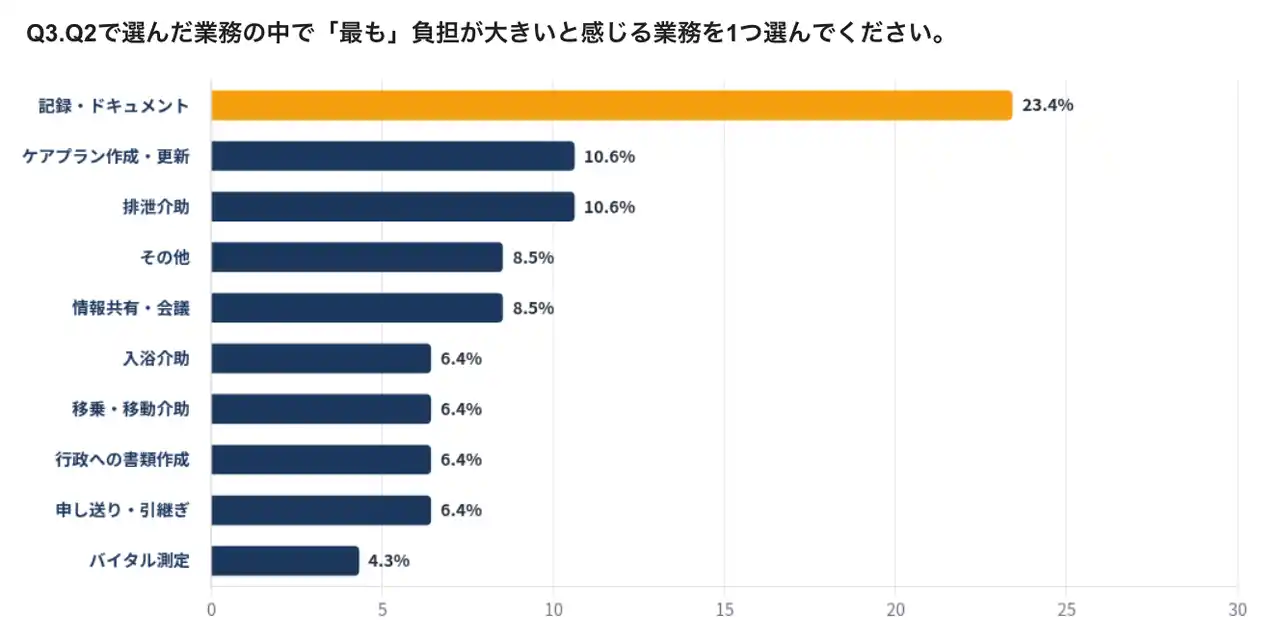 また、「最も負担が大きい業務(1つ選択)」でも、「記録・ドキュメント入力」が23.4%でトップでした。ケアプラン作成・更新(10.6%)や排泄介助(10.6%)が続きました。 |