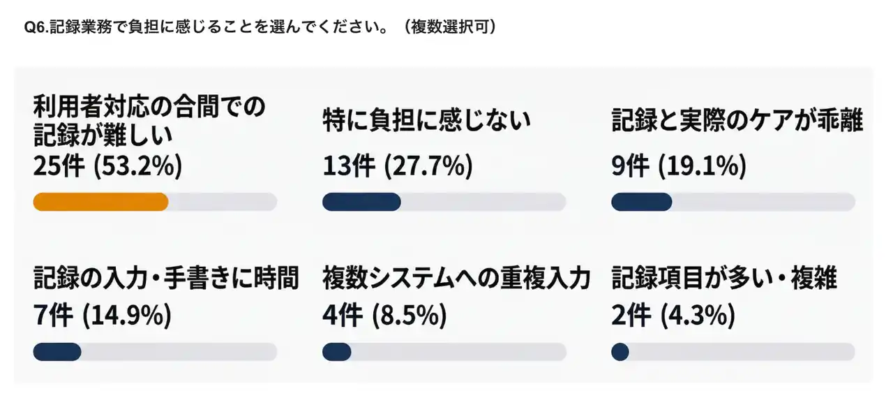 記録業務で負担に感じることを尋ねたところ、「記録のタイミング(利用者対応の合間に記載)が難しい」が53.2%でトップでした。「記録と実際のケアが乖離してしまいがち」が19.1%、「記録の入力・手書きに時間がかかる」が14.9%と続きました。 |