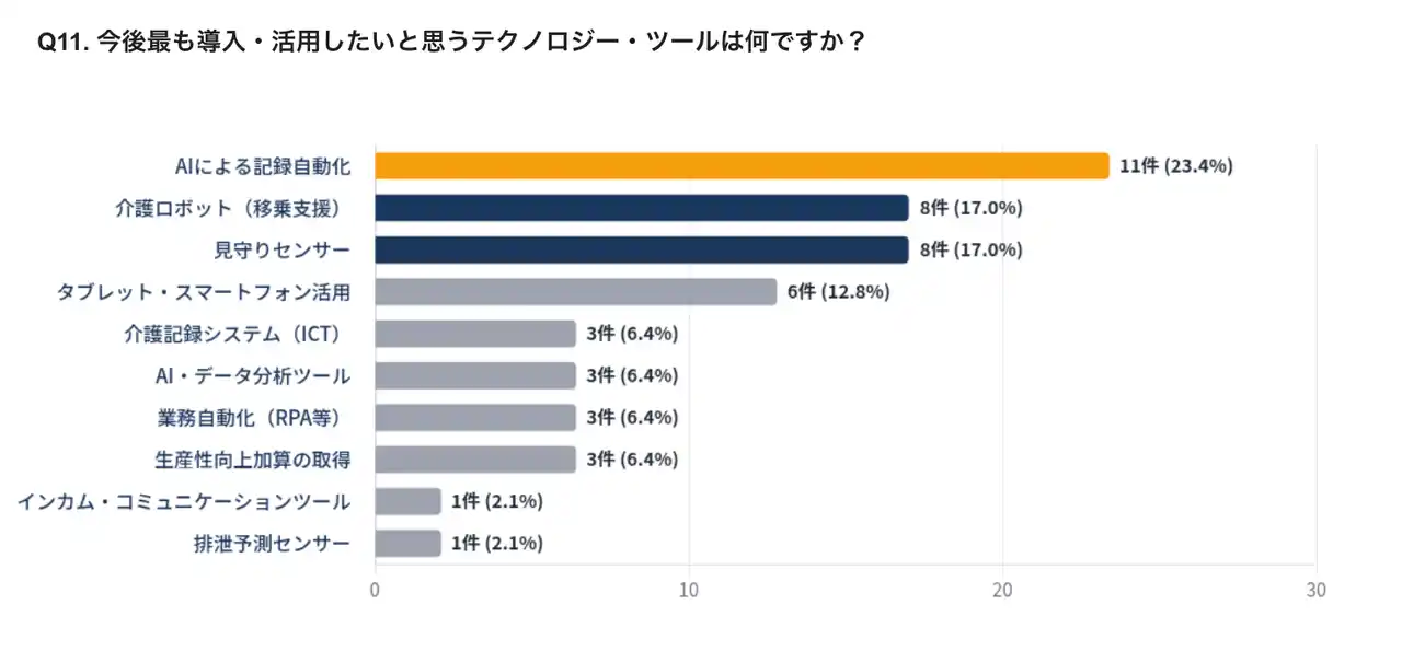 一方で、今後最も活用したいツールとして「AIによる記録自動化」や「見守りセンサー」「介護ロボット」を挙げる声も多く、現場にはテクノロジーへの期待と、コスト・習熟面での不安が共存していることが伺えます。 |