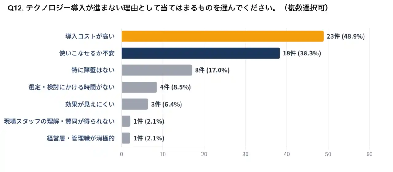テクノロジー導入が進まない理由を尋ねると、「導入コストが高い」が48.9%で最多でした。「使いこなせるか不安」が38.3%で続き、費用面と習熟面の両方がボトルネックとなっていることが分かります。 |