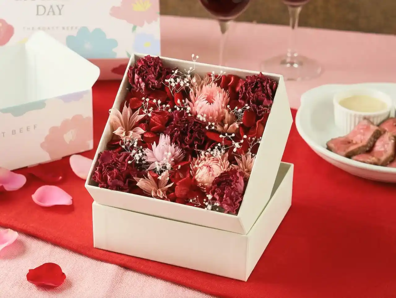 フラワーBOXは、プリザーブドフラワーならではの美しさが長く続き、そのまま飾れる手軽さと、空間にそっと彩りを添える存在感を兼ね備えています。「お肉だけでは少し寂しいかも」という贈り手の気持ちに寄り添い、食卓だけでなく空間全体を彩る存在として設計しました。 |
