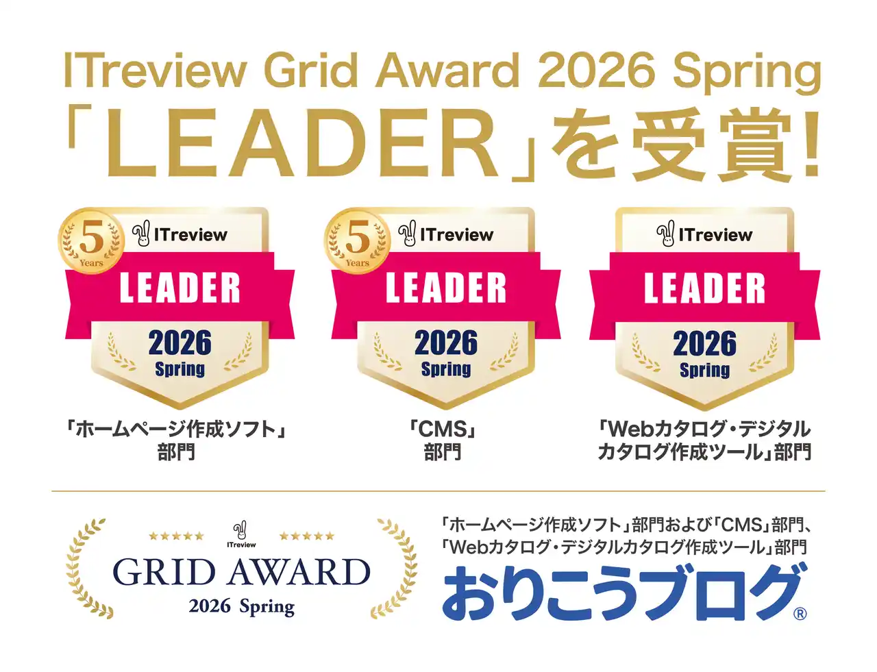 株式会社ディーエスブランド(本社:長崎県長崎市 販売本部:東京都中央区、代表取締役社長:下山大祐)が開発・提供するWebサイト作成ツール(国産CMS)『おりこうブログ』が、アイティクラウド株式会社(本社:東京都港区、代表取締役社長 兼 CEO:黒野源太)主催の「ITreview Grid Award 2026 Spring」を3部門で受賞しましたので、お知らせいたします。 |