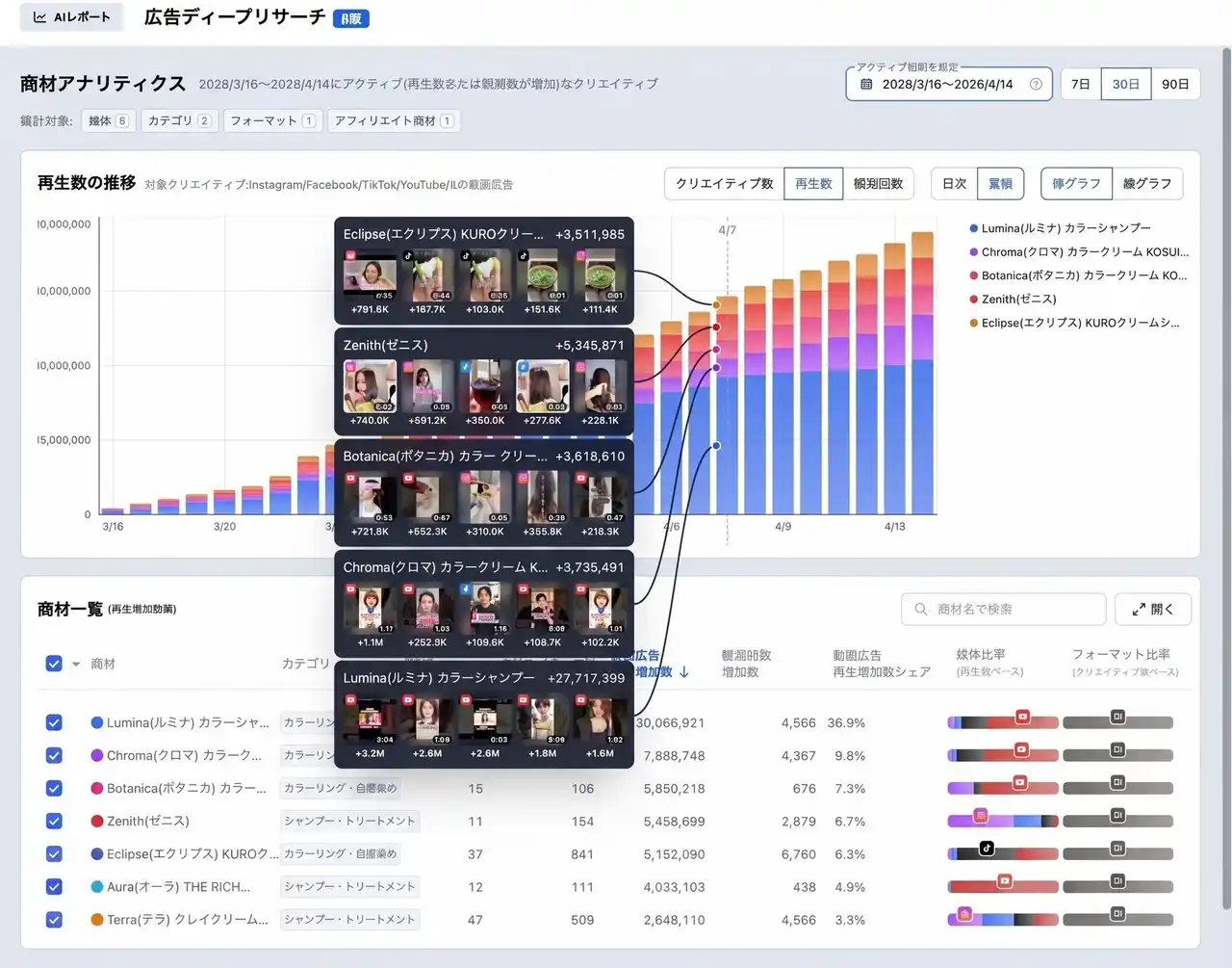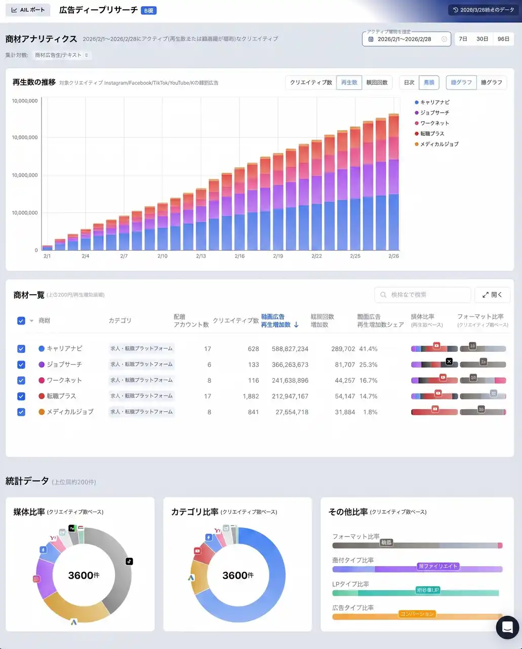 媒体横断検索、広告主/商材名検索、LP逆引き、再生数/リアクション分析 |