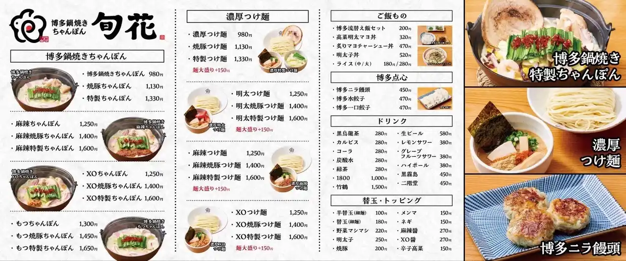 | 「旬花」は、かつての「長崎ちゃんぽん 旬」の店主とともに開発を重ね、伝統の味をベースにしながら、福岡ならではの新たなちゃんぽん文化の創出を目指して誕生しました。 | ||||||||||||||||||