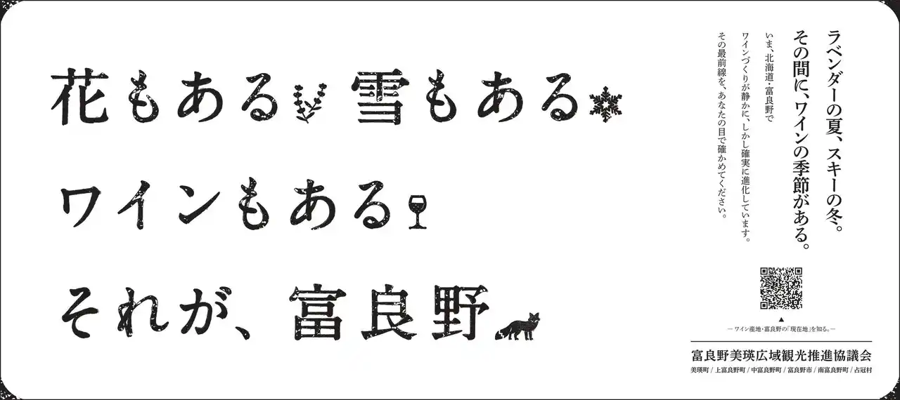花や雪に加え、ワイン産地としての富良野の魅力をより多くの人に伝えるために制作した新聞広告ビジュアル |