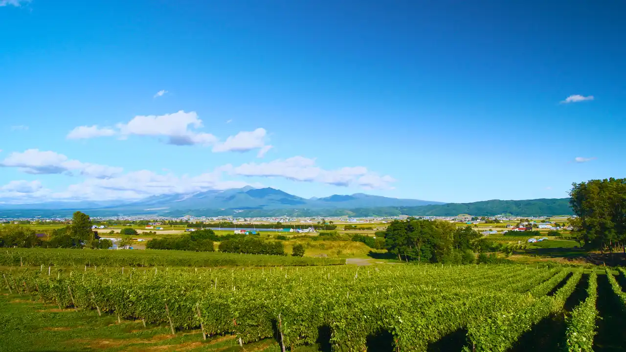 ふらのワインの圃場から望む富良野の風土と広がりを感じる景観 |