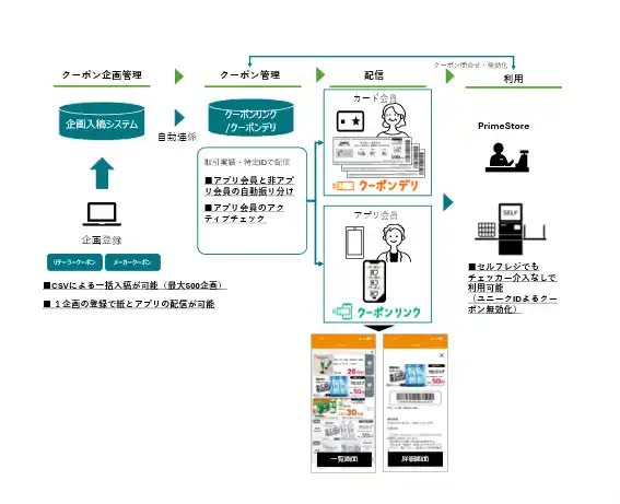 今回提供開始する「クーポンリンク」は、小売企業のアプリクーポンと紙クーポンを統合的に運用できるクーポン配信サービスです。 |