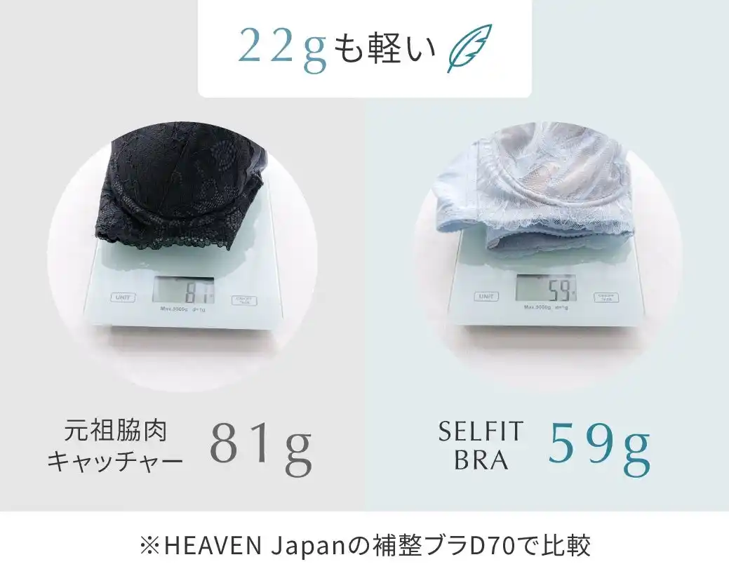 「快適な着け心地」「バストの形を整える機能」「服を着たときの立体感」すべてのこだわりを叶えるHEAVEN Japanの下着は、下着を作り続けて45年以上のパタンナーの知見がいたるところに詰まっています。何度も試作とスタッフによる試着を繰り返し、納得のいく商品だけをお届けしています。 私たちはこれからも、女性のライフスタイルにあわせた適正下着(R)をつうじて、一人ひとりの体のお悩みに寄り添ってまいりたいと考えております。 ※ノンパテッドブラとは、レースだけでバストを包み込む、パッドのないブラジャーのこと。 ■商品情報 商品名:SELFIT BRA 価格:7,480円(税込) サイズ:カップC~D、アンダー65~80センチ |
