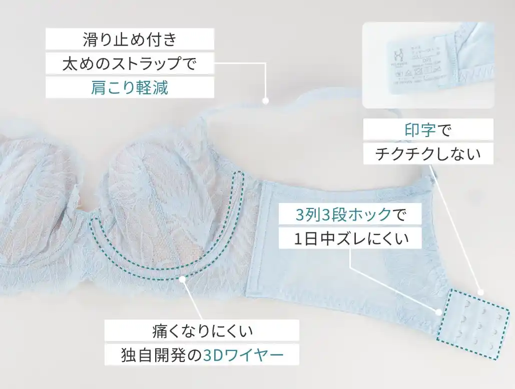 | 長時間つけてもストレスを感じにくい設計です。さらに、肩への負担を考えた太めストラップや、チクチクしにくい印字仕様の洗濯表示など、細部までとことん快適さにこだわっています。 | |||