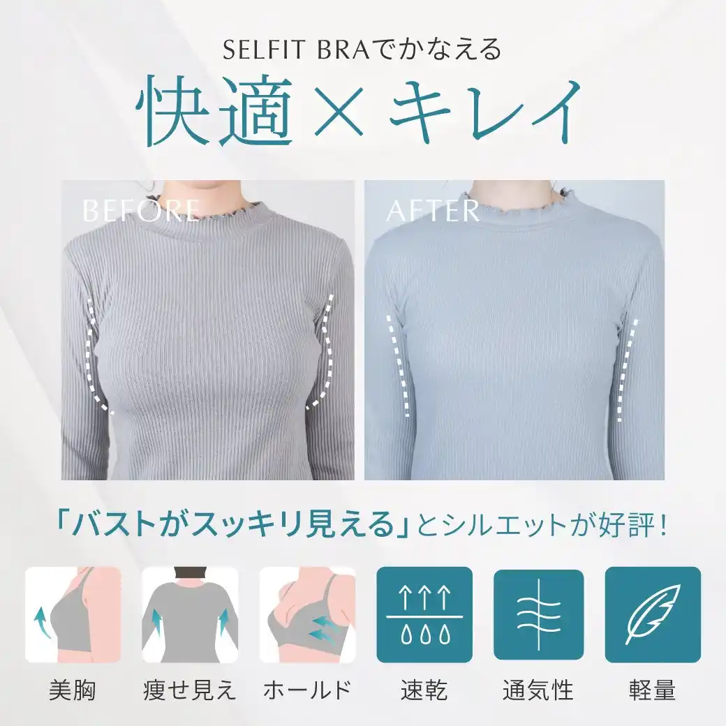 | 圧倒的な軽さと薄さでとっても涼しく乾きやすい。夏の猛暑対策や汗対策におすすめの「SELFIT BRA」。その特徴は以下の4つとなります。 | |||