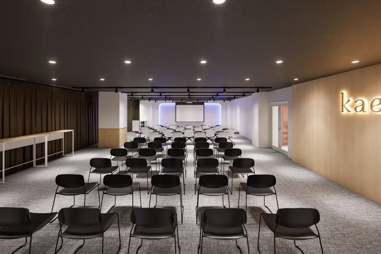 | 小規模なミートアップが盛んな渋谷において、あえてまとまった人数を収容できる発信拠点を設けました。イノベーターたちの意志が放たれる瞬間を象徴する「カエカ独自のステージ」を完備。聴衆との一体感を創り出し、社会へ言葉を届ける実戦の場として活用いただけます。 | |||