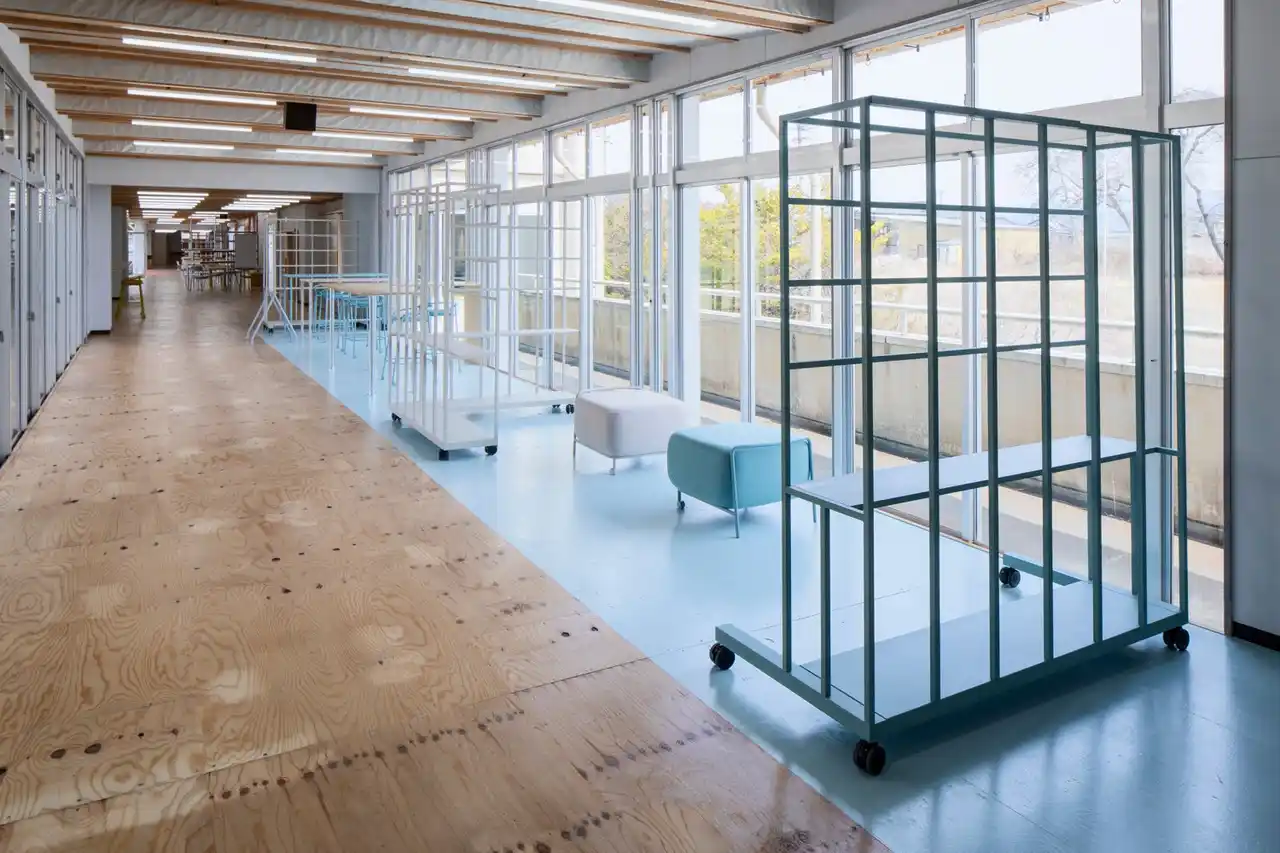 校舎のメイン動線である大廊下に、子どもたちが自ら空間を仕切ったり、探究学習の成果を展示したりできる可動式パーティション「Any Wall(エニーウォール)」を設置。展示のレイアウト変更や、そこから生まれる他学年との交流や対話にどう寄与するかを観察します。 |