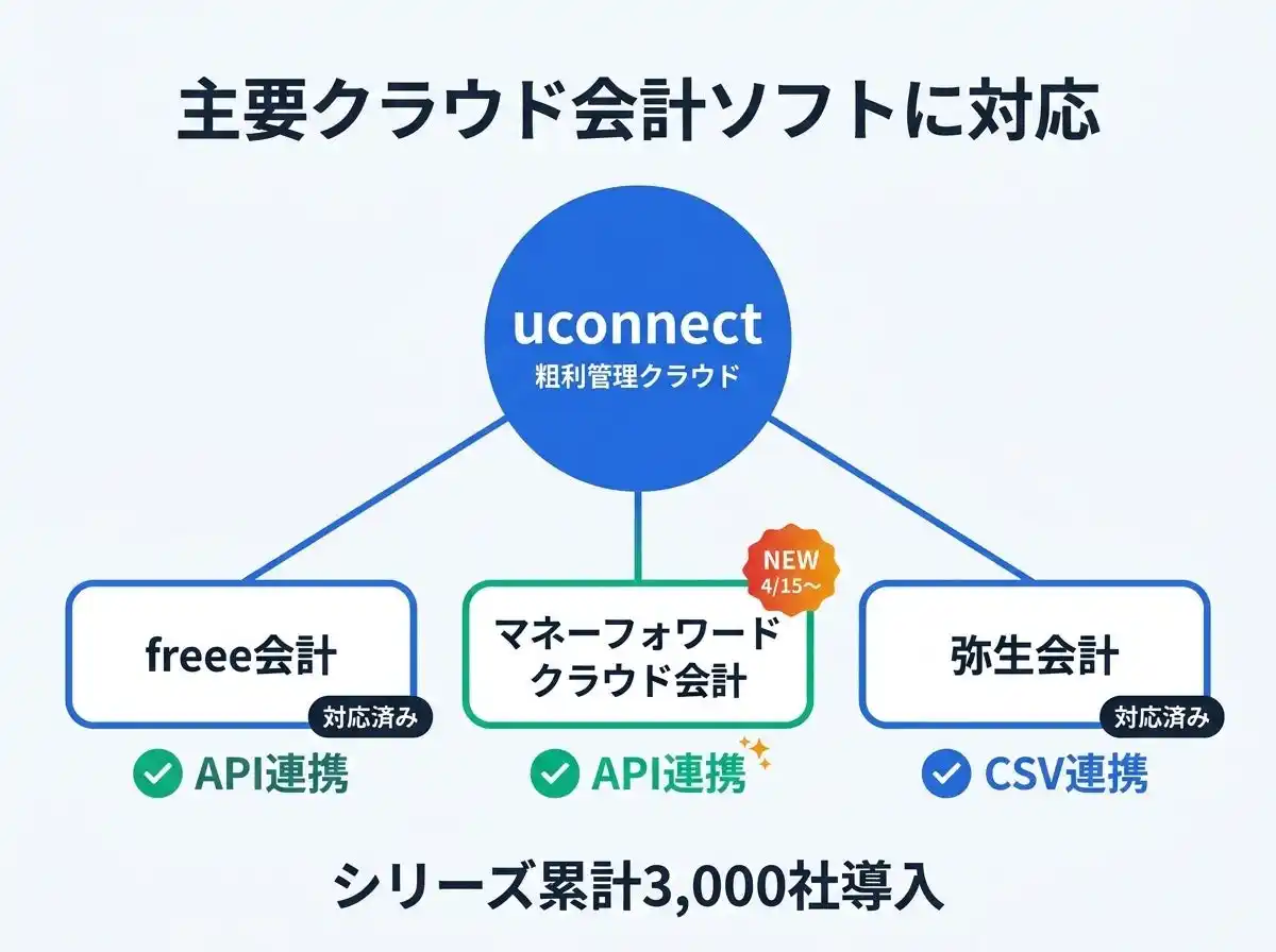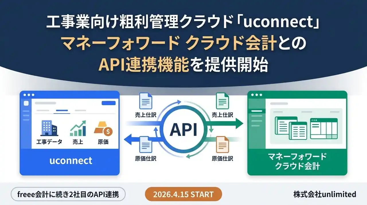 株式会社unlimited(本社:山口県周南市、代表取締役:橘貴督、以下「unlimited」)は、2026年4月15日(水)より、工事業向け粗利管理クラウドソフト「uconnect」(ユーコネクト)において、「マネーフォワード クラウド会計」とのAPI連携機能の提供を開始いたします。本機能により、「uconnect」で管理する売上・原価の仕訳データを「マネーフォワード クラウド会計」へワンクリックで連携でき、工事会社の経理業務における二重入力を解消します。 |