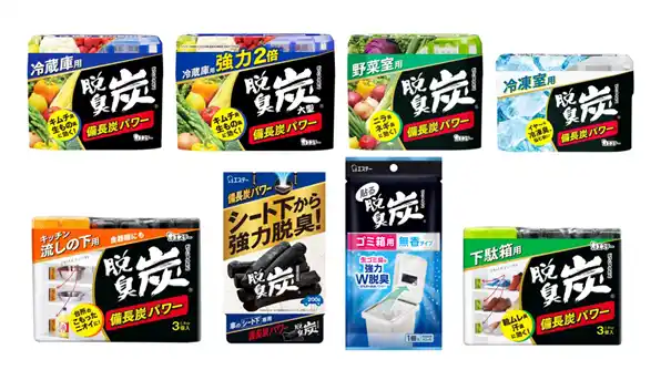 2000年に「脱臭炭 冷蔵庫用」「脱臭炭 下駄箱用(現:脱臭炭 下駄箱用 こわけ 3個入)」「脱臭炭 キッチン用(現:脱臭炭 キッチン・流しの下用 こわけ 3個入)」の発売を開始し、その後「冷凍室用」、「クルマ用 シート下専用」と用途を拡大。2025年2月には、「ゴミ箱用」を新たにラインナップしました。 |