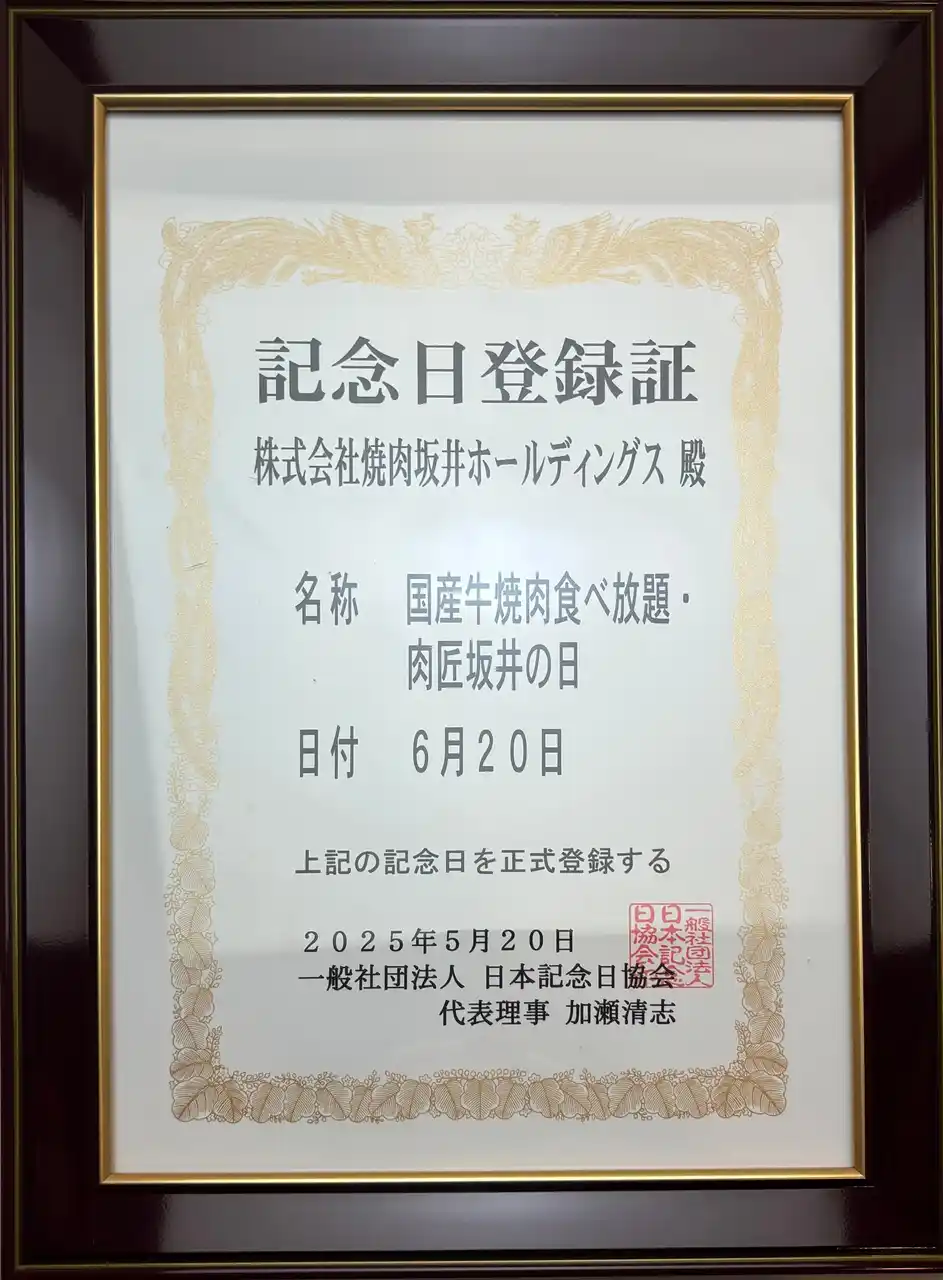記念日名称:国産牛焼肉食べ放題・肉匠坂井の日 記念日日付:6月20日 正式登録日:2025年5月20日(火) |