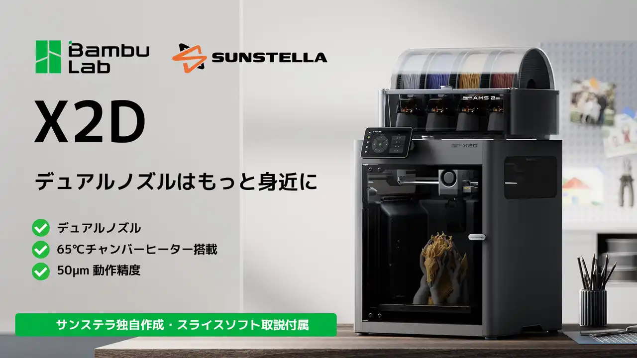 株式会社サンステラ(本社:東京都)は、Bambu Lab製の最新デュアルノズル3Dプリンター「X2D」の国内展開を開始いたしました。 |