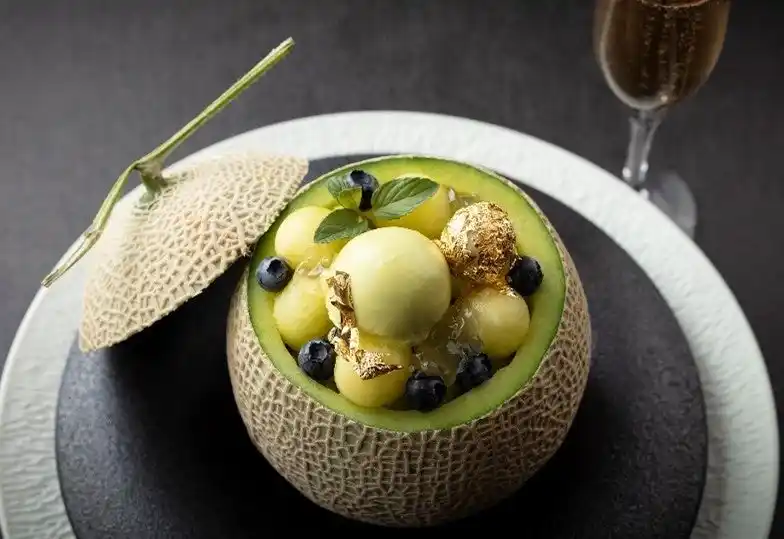 | マスクメロンをまるごと1個使用し、メロンのソルベとブルーベリー、金箔をあしらった一品。 | ||||||||||||||||||||||